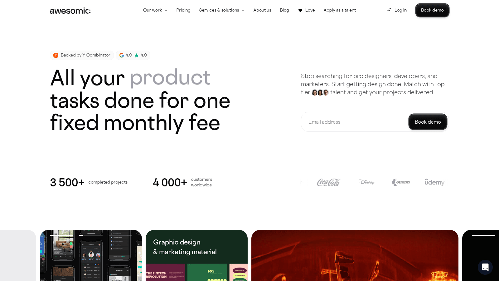 This means you get expert creatives without the hassle of hiring or managing freelancers. We serve over 4,000 customers worldwide, proudly working with powerhouses like Y Combinator, Coca-Cola, Disney, and Udemy.
