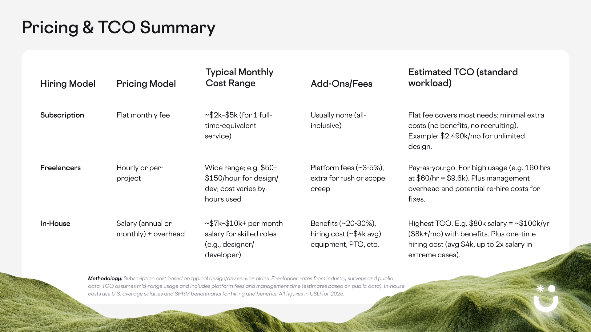 - Estimated TCO: For a standard workload (say the output of one full-time designer or developer), the TCO is roughly the flat fee itself, since overhead is absorbed by the service. For instance, if you pay $3,000/month for a design subscription, that covers all design tasks, revisions, project management, then you likely won’t incur other costs. Compared to hiring, you save the cost of recruitment (avg $4,000+) and avoid paying for idle time during slower periods.
