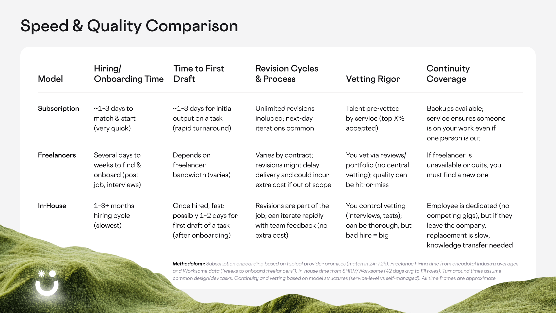 In terms of speed to start, subscription usually wins, followed by freelancers (if you’re lucky in finding quickly), and in-house lags far behind. For throughput and ongoing speed, a lot depends on your workload: in-house gives consistent daily effort; subscription gives bursts of deliverables but one at a time (unless you scale up); a freelancer might deliver fast then have downtime if you don’t have continuous projects (or if they do, it means they’re working for others, not you). For quality and revisions, in-house is tipically ideal (they can refine endlessly as part of salary), but a good subscription service comes close by bundling unlimited revisions and having a quality vetting in place. Freelancers can produce great quality, but there's also the risk of variance.
