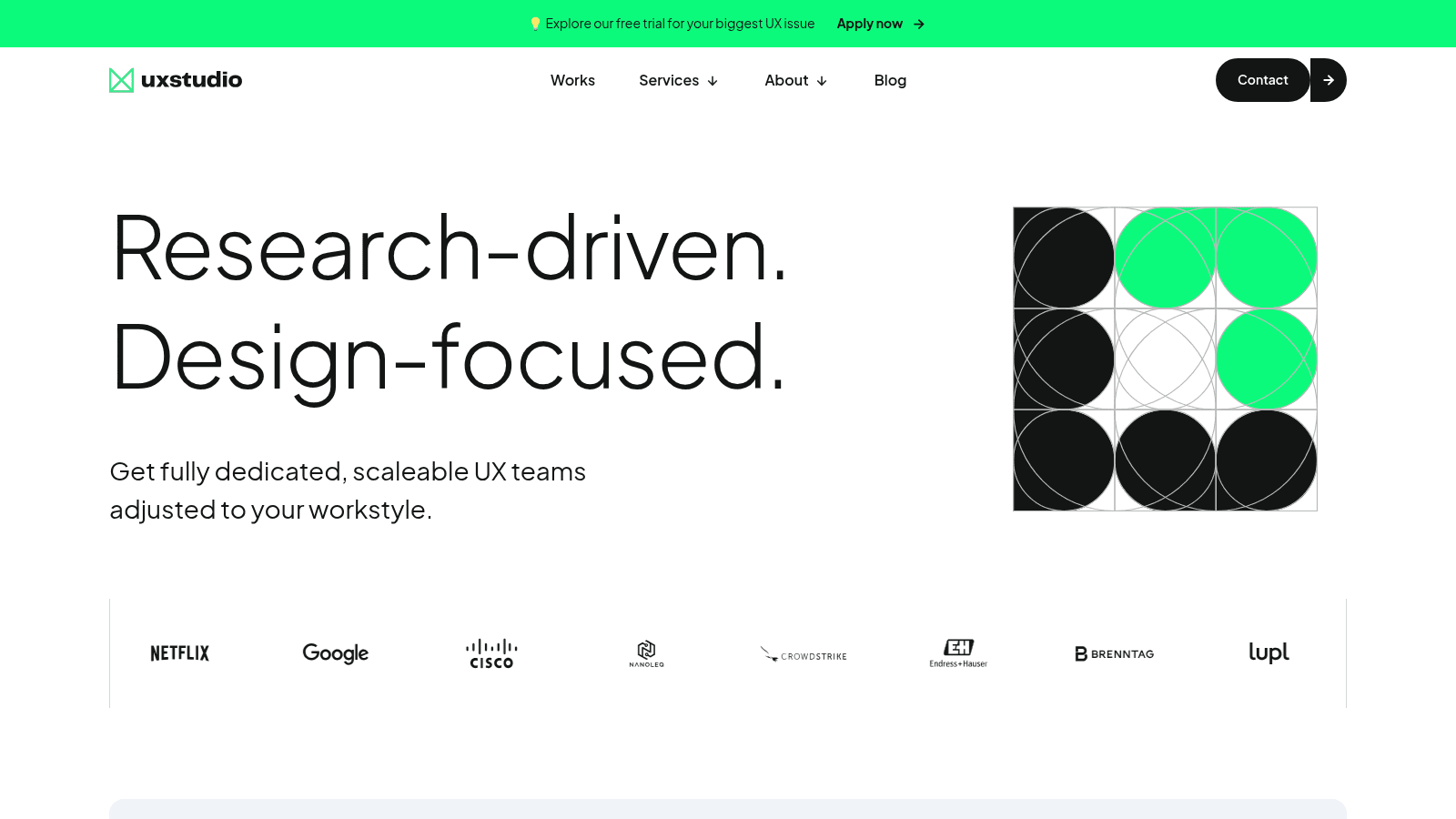 Their team includes over 40 senior designers trained through an intensive 3-month bootcamp, continuously overseen by senior staff. They serve clients by embedding designers directly into their teams with flexible, month-to-month subscriptions.