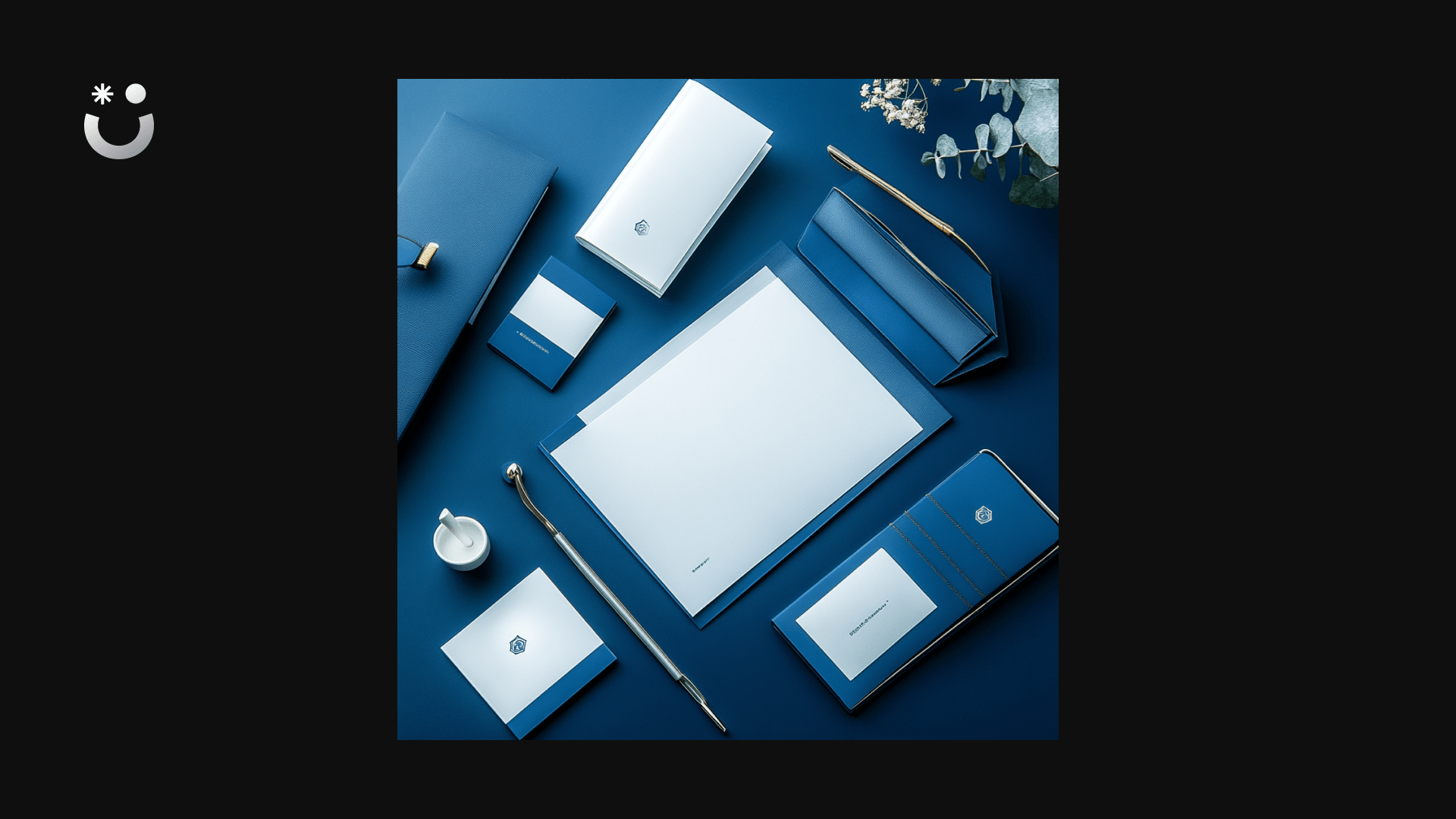 - Logo Emphasis: “Business card::2 with centralized large blue and white logo::3, minimalistic background::1, and gold foil accents::1.”